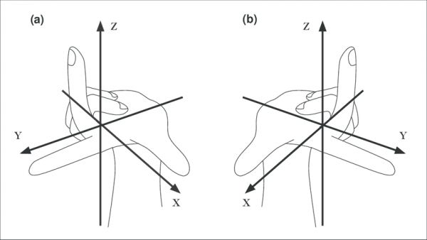 图:左手坐标系(左)和右手坐标系(右)[1]。当我们把左手坐标系的三条坐标轴都反演一次,我们就可以得到一个右手坐标系。为方便与左手坐标系对比,图中显示的右手坐标系以两只手中心的连线为轴上下旋转了180度,使其z轴朝上。