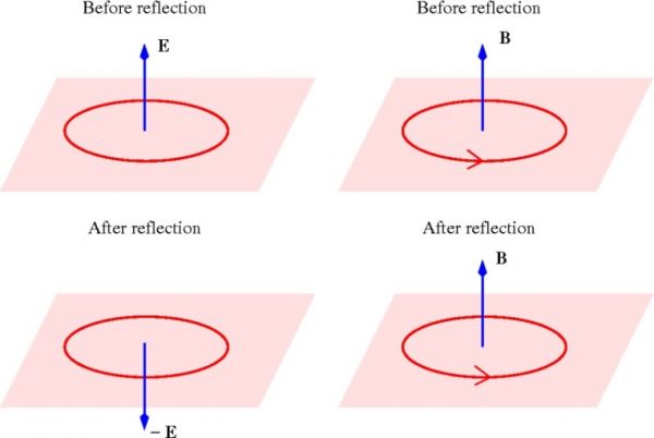 图:宇称变换后的电场(左)和磁场(右)[2],其中电场强度是矢量在宇称变换后会反向;而磁场强度是赝矢量,在宇称变换下方向不变。