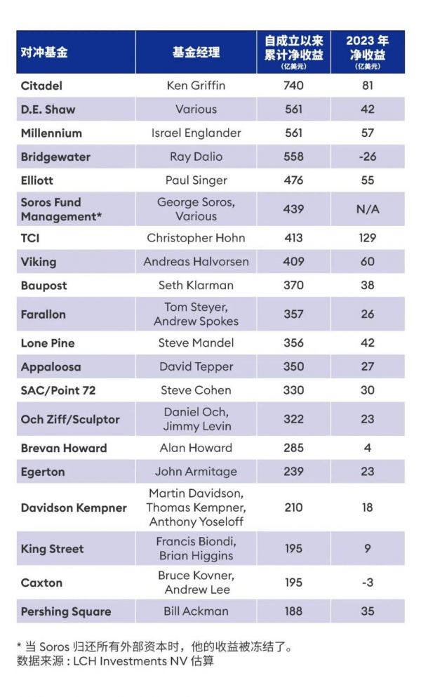 据LCH Investments发布的全球对冲基金经理20强年度报告显示,格里芬的公司在2023年为投资者创造了约81亿美元的净利润,使其自成立以来的累计收益估值达到了在行业中遥遥领先的740亿美元。