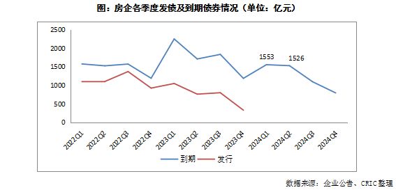 克而瑞统计数据显示,2023年房企发债规模约3056亿元,同比下降31%。其中,境内发债2963亿元,同比下降15%;境外发债93亿元,同比下降90%,占比下降18个百分点至3%。值得注意的是,今年一、二季度仍是偿债高峰,到期规模均在1500亿元以上,房企的债务压力依然较大。