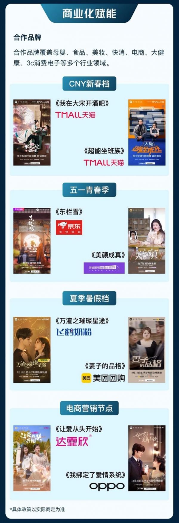作为国内档期化短剧运营的先行者,快手短剧将结合CNY新春档、五一青春季、夏季暑期档,以及双十一、双十二电商节等品牌全年关键营销节点,从档期冠名到品牌植入,全面灵活适配品牌个性化的商业需求,高效满足品牌曝光和转化,帮助短剧项目实现增收。