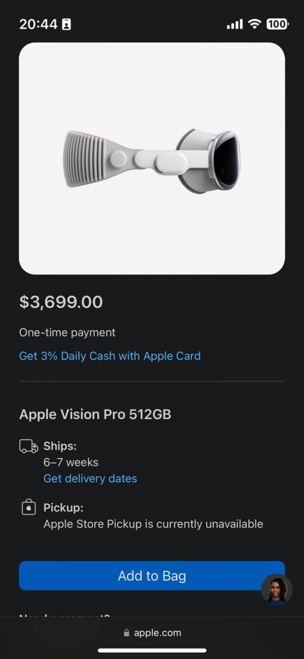 2 月 2 日起,苹果Vision Pro将在美正式开卖。1 月 19 日预售开启,虽然要求买家全额预购和进行FaceID识别,但依然瞬间卖断货,所有版本都在短时间内销售一空。不同存储规格版本的出货时间,也在开放预售后的几个小时内普遍延长到了 6 至 7 周。