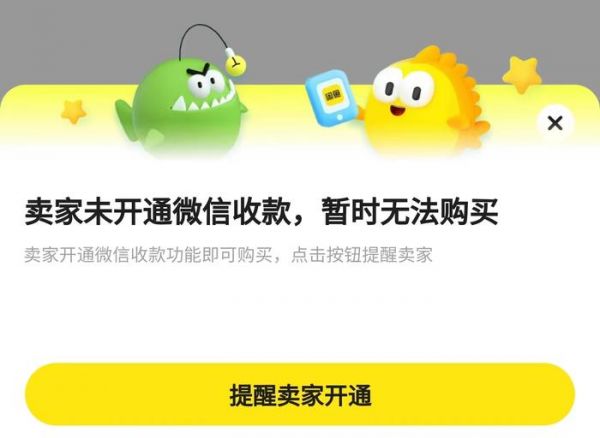 (图源闲鱼微信小程序)需要注意的是,用户在闲鱼微信小程序上购买商品前,必须确认卖家已经开通了微信收款功能。如果卖家未开通此功能,买家将遇到一个弹窗提示“卖家未开通微信收款,暂时无法购买”,同时提供一个按钮提示卖家去开通,根据‘开通微信收款’的页面信息,交易成功后,资金会转入卖家的闲鱼微信收款余额。商家可以将这些余额无手续费且即时提现至自己的银行卡。