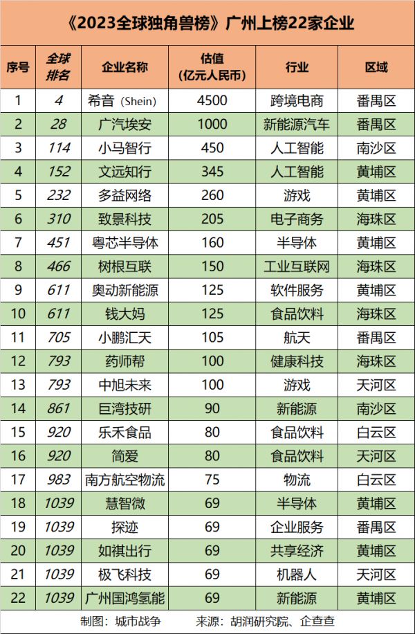 根据胡润研究院发布的《2023年全球独角兽榜》,广州共有22家企业上榜,位列全球第8、全国第4。