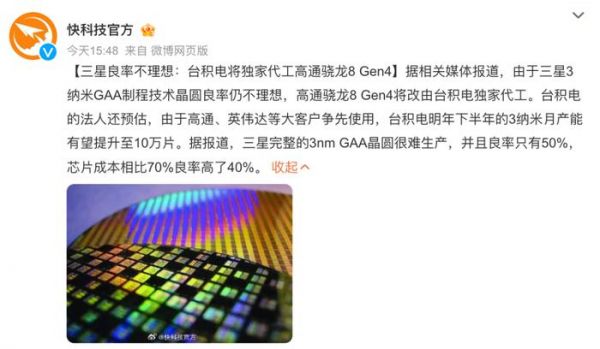 不过,快科技随后的一份报道中显示:“由于三星3纳米GAA制程技术晶圆良率仍不理想,高通骁龙8 Gen4将改由台积电独家代工。”“据报道,三星完整的3nm GAA晶圆很难生产,并且良率只有50%,芯片成本相比70%良率高了40%。”