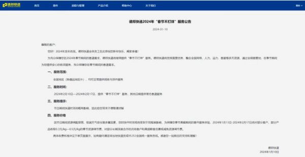 1月10日,德邦快递正式官宣今年春节不打烊,也是德邦连续第四年春节无休,主打“除夕能发货,初一也送货”。同时,德邦表示1月13日-2月17日将对部分客户、部分产品收取0.3元/kg-0.5元/kg的春节资源调节费,对部分长期深度合作的月结客户和高频散客优惠或减免资源调节费。