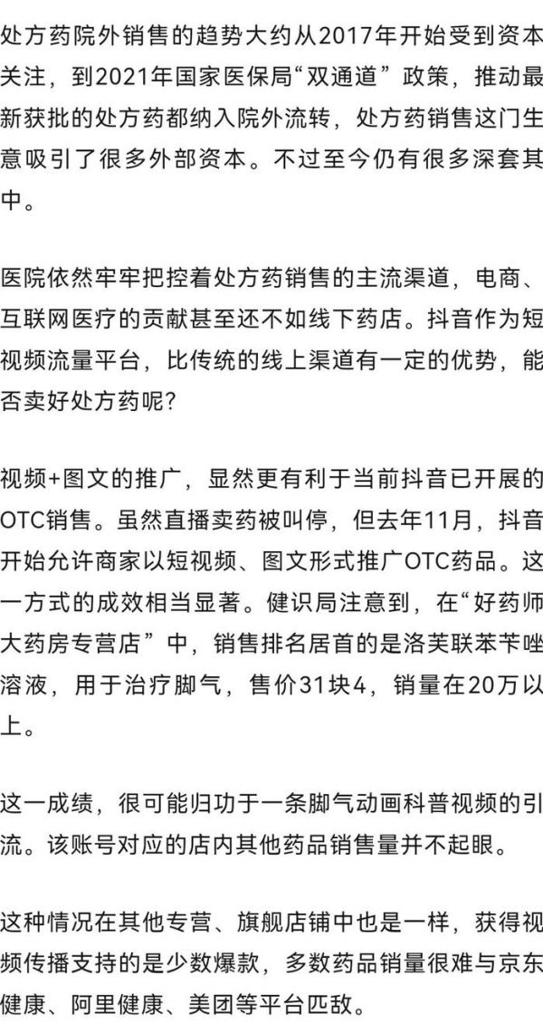 过去几年电商行业闻抖音色变,2023年抖音甚至开始本地生活业务,直接瞄准本来挺滋润的美团。可以说凡是涉及消费的行业,就没有抖音插不上手的。但在销售处方药这一业务上,抖音暂时没办法“颠覆”固有市场。