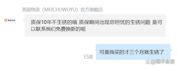 京东“年货节”期间,本人与商家客服联系时,商家客服一开始还信誓旦旦称:质保10年不生锈的哦”。