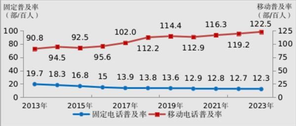 公报显示,2023年,全国固定电话用户总数1.73亿户,全年净减608.8万户,普及率为12.3部/百人,比上年末下降0.4部/百人。