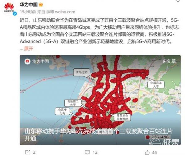 最近,华为中国官方宣布了一个好消息:山东移动和华为在青岛城区成功开通了500个三载波聚合站点,这标志着山东移动成为了全国首个实现百站三载波聚合连片部署的运营商。