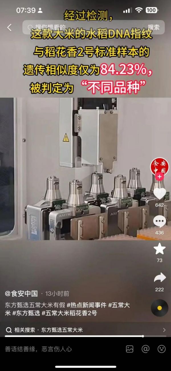 1月22日,@中国食品安全网 发博打假东方甄选带货的一款稻花香2号五常大米,称经过检测,该款大米的水稻DNA指纹与稻花香2号标准样本的遗传相似度仅为84.23%,被判定为“不同品种”。
