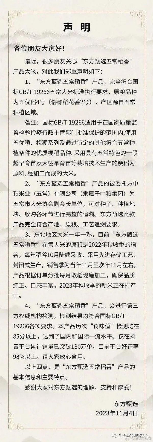 图源:抖音那么东方甄选对此的态度是什么呢?去年11月已经有打假网红称东方甄选的大米吃起来、闻起来不像五常大米。东方甄选的回复是:“东方甄选五常稻香”产品完全符合国标 GB/T 19266 五常大米标准执行要求,原粮品种为五优稻 4 号(俗称稻花香 2 号)。