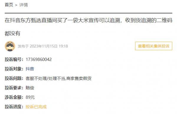 图源:东方甄选官博但令人疑惑的是,同一时期有消费者反映,在东方甄选购买的大米上,没有可以溯源的二维码,而直播中东方甄选却宣传可以溯源。