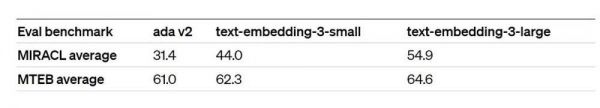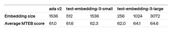 比如,在MTEB基准测试中,一个text-embedding-3-large嵌入可以被缩短到256的大小,但其测试成绩仍然优于一个未缩短的、大小为1536的text-embedding-ada-002嵌入。