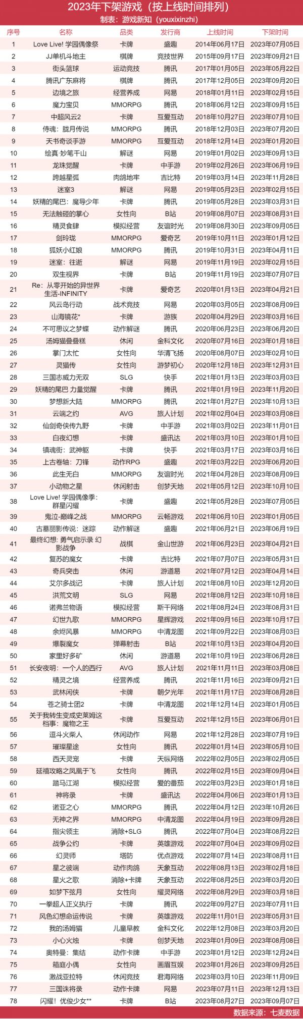 游戏新知统计了2023年下架的全部游戏,并根据产品质量和发行商知名度进行了筛选,得到了78款游戏(注:仅包含iOS;休闲品类迭代较快,因此未加入表格中)。我们能从中发现市场风向正在发生变化,也能观察到一些头部厂商的最新动向。