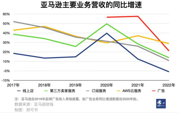 事实上,亚马逊的压力不完全来自对手。2021年,亚马逊电商及相关业务增速开始放缓,线上店营收同比增速从2020年的40%跌至13%、第三方卖家服务营收同比增速从50%跌至28%。2022年,线上店营收同比降低1%,第三方卖家服务营收同比增速仅14%,原本同比增速近60%的广告营收增速放缓至21%。