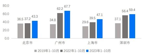 去年贝壳研究院做过一个不完全统计,截至10月底,一线城市在平台上挂牌“租售房源”的房源量同比高出10%以上。贝壳研究院报告还指出,去年1~10月,深圳房源成交周期达到近2个月,广州超过2个月,上海超过1.5个月,北京接近1.5个月,而在2019年1~10月,四个城市的房源成交周期均在40天内,其中上海房源成交周期在1个月左右。