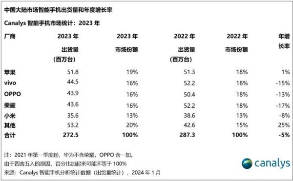 Canalys 在其报告中称,2023 年第四季度,中国大陆手机市场跌幅进一步收窄,整体出货 7390 万台,同比下跌 1%。