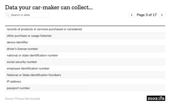 注意右上角,车辆所搜集的个人信息条目可达整整17页|Mozilla