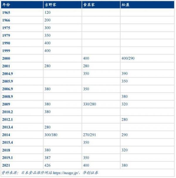 上世纪 90 年代日本泡沫经济破灭,2001 年三大牛肉饭巨头,吉野家、食其家和松屋打了一场价格战,其中两家都将价格降到 280 日元。按当时的汇率计算,刚好人民币 19 元。到今天 20 多年虽然看起来有涨价,但按如今的日元汇率计算,仍旧死死地卡在 20 元以内。