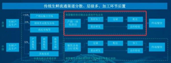上图来自中国烹饪协会发布的《2023中国餐饮供应链白皮书》,我们明显能看到,中美生鲜供应的流通链条,从产地批发环节就不同了。美国在生鲜产区超过60%进入产地运输市场,20%进入批发市场,也就是80%以上已经确定了生鲜运输或加工的链路。