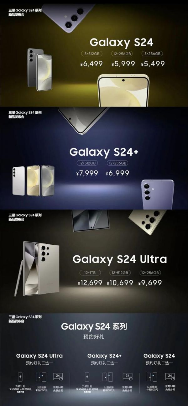 如上图所见,【三星S24】8+256GB版售价5499元,12+256GB版5999元,8+512GB版6499元;【三星S24+】12+256GB版6999元(权益可免费升杯512GB),12+512GB版7999元;【三星S24 Ultra】12+256GB版9699元(可免费升杯512GB),12+512GB版10699元,12GB+1TB版12699元。整体比先行者计划尝鲜价便宜500元。细节上,可以看到全系没有16GB,作为全球老大多少还是有些尴尬吧。