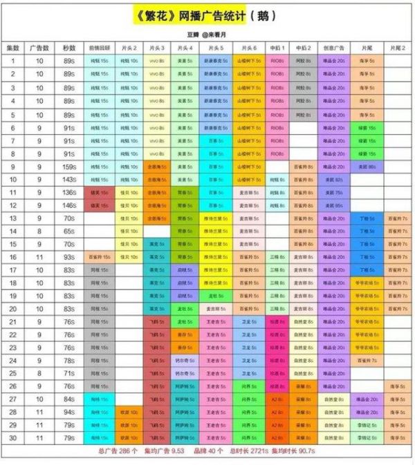 《繁花》火出圈,金主笑开颜。大结局当晚,《繁花》官方连发4条微博向合作品牌致谢,内容组合起来,赫然是一份多达40+的广告主名单。根据豆瓣用户@来看月不完全统计,截至收官,繁花收获40+广告主共291个广告投放总量,平均每集9.7个广告,最高一集有11个广告。