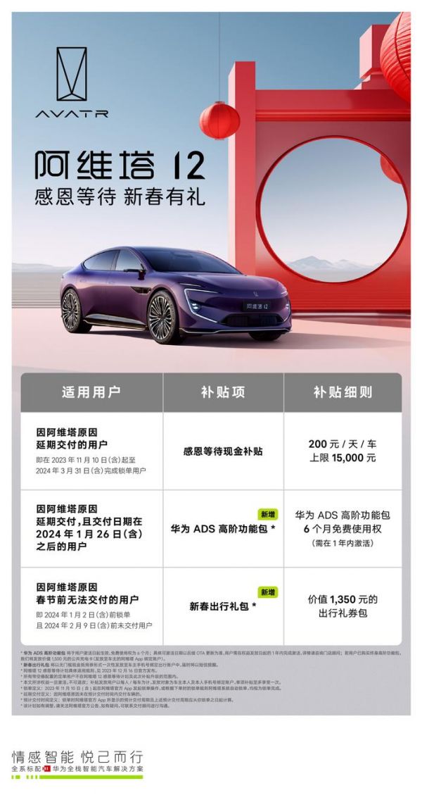 因阿维塔原因,春节前无法交付的用户(1 月 2 日及以前锁单、2 月 9 日及以前未交付用户):赠送 1350 元出行礼券包。