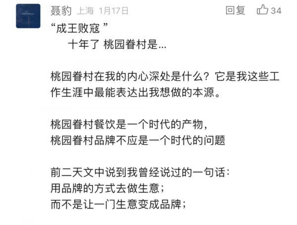 图片来源:桃园眷村公众号,在1月17日的推文下,创始人聂豹写下了他对品牌的理解和定义