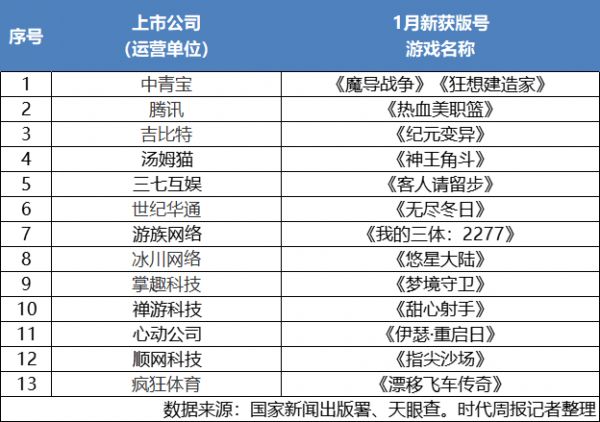 从游戏运营单位来看,有13家上市公司旗下运营的游戏获得版号。