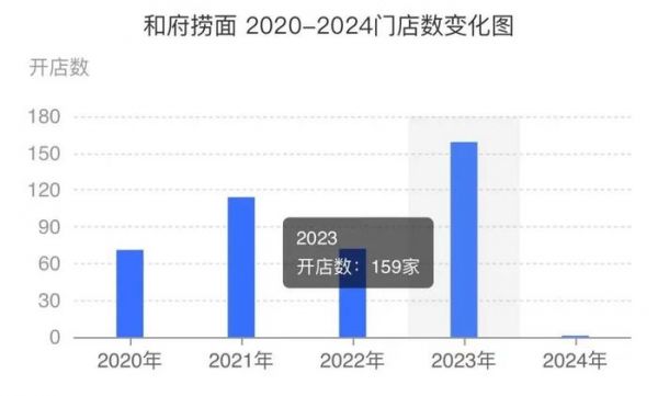 图:窄门餐眼显示2023和府捞面新开店159家, 与李学林的说法有出入不过,窄门统计数据与李学林的说法有所出入。尽管如此,对比2021-2022年,这个数字还分别是114家和72家,可以确定的一点是:和府捞面开店的速度提高了。