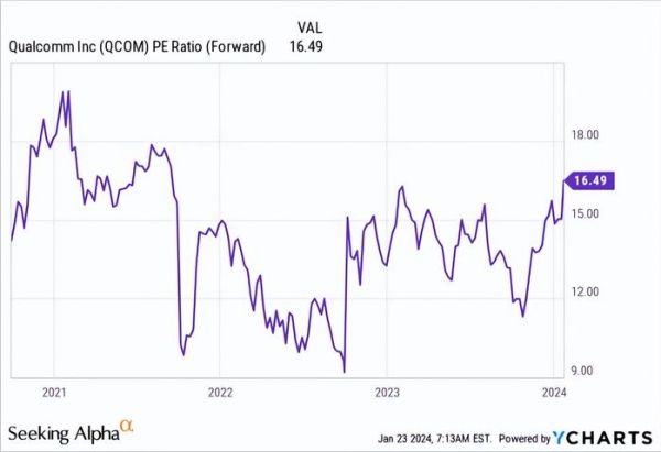 高通目前的市盈率约为 16 倍,其预期市盈率目前预计低于 15 倍。这一预期市盈率大约是高通过去几年的平均水平,如下图所示。然而,高通现在的增长前景可能是过去以来最强劲的,因此更高的市盈率(可能在 18-20 左右)是有必要的。高通以前就见过这种倍数。如果估值倍数扩大,高通在未来几个季度可能会有约 20-30% 的上涨空间。