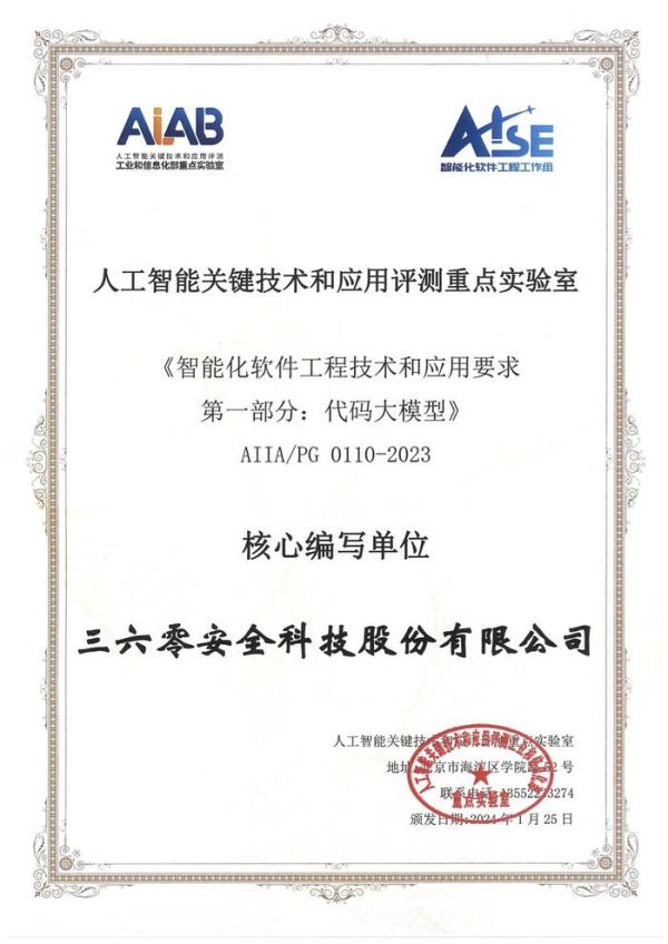 1月25日,中国信通院、中国人工智能产业发展联盟等单位主办的大模型应用行动暨首站“AI4SE创新巡航”召开。活动中,中国信通院和中国工商银行联合牵头发起的《智能化软件工程技术和应用要求 第1部分:代码大模型》标准正式发布,三六零集团被授予核心编写单位,参与代码大模型行业标准编写,助力软件工程进入智能化时代。