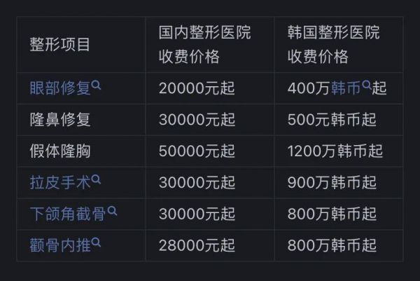 以拉皮手术为例,想找一位临床经验在20年以上,且主攻该领域的医生做手术,国内起码要七八万元。但在韩国,请相等资历的医生做手术,费用也就1200~1500万韩币(约合人民币6万多到8万元)。不少消费者认为,相同的项目,在韩国能够同时做到物美且价廉。
