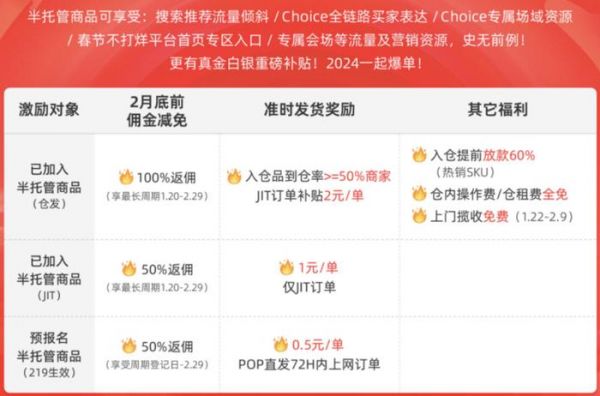 具体而言,速卖通半托管补贴福利包括,半托管商品入仓100%免佣;春节期间准时发货,每单享受最高2元补贴;半托管商品入仓,上门揽收费全免、仓内操作费全免、仓租全免等等。