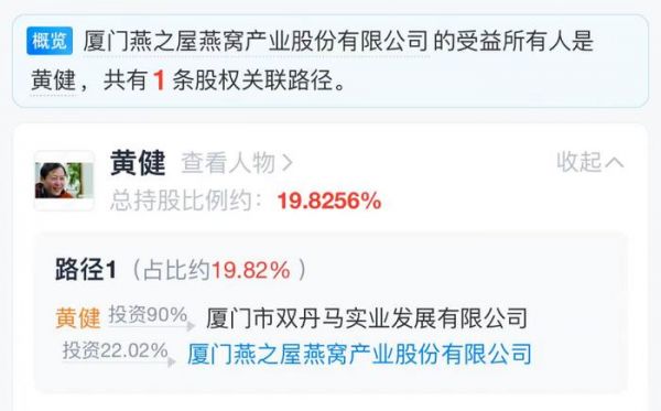 天眼查显示,黄健依靠“厦门市双丹马实业发展有限公司”持有燕之屋19.8%的股份,照此换算黄健身价约8.8亿(不算套现和其他)。