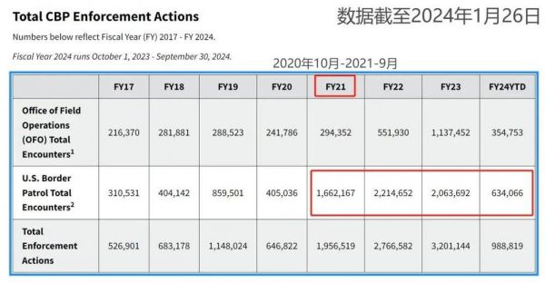 美国海关和边境保护局官网数据显示,从2021财年开始,美国边境巡逻队报告的边境“遭遇事件”(非法越境、走私,以及逮捕和拘留)数量迅速激增,差不多一年要200万人左右,远超此前的特朗普政府时期。