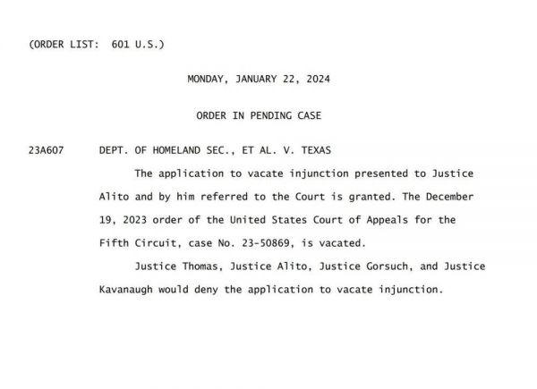 美国高院上周一发出的命令中,一共只有3句话:就国土安全部与得州政府的官司,美国高院撤销了下级法院发出的禁止令,9名大法官以5比4的投票做出了这一决定。