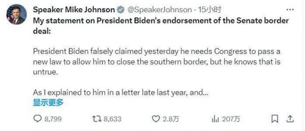 现任美国众议院议长约翰逊也强调,拜登在撒谎,他根本就不需要国会立法,就能动用行政令迅速加强边境管控。