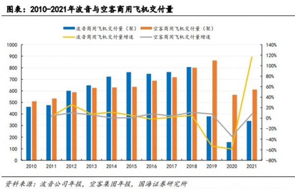 从2010年至2021年间,波音(蓝色)和空客(橙色)商用飞机交付量对比。(图/国海证券研究所)