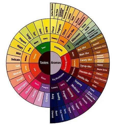 在我还比较习惯惺惺作态的时候,尝试研究过图1所示的咖啡风味轮盘。希望在接过一杯50mL、刚刚用9bar压强萃取(化学上的“萃取”多用来表示液体/液体溶出分离,咖啡则是“固-液”萃取,化学上用“浸取”表达为主)出来的意式浓缩时,快速吮吸入口,然后并得出诸如“前调有坚果和黑巧克力的味道,后调则有明显的柑橘风味”之类的结论。