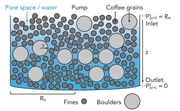 而模型还根据实际情况进行了修正,因为在实践中,随着磨豆机设置的期望粒径越来越小,并非所有的咖啡豆都能被均匀地磨细,总有一些相对较大的颗粒没有被磨至期望粒径。在热水冲调时,这些大颗粒与水、其他细粉的相互作用不尽相同,形成部分阻塞的流体。(对于部分阻塞流体,Hendon模型用图4C中的黄线来进行表示。)