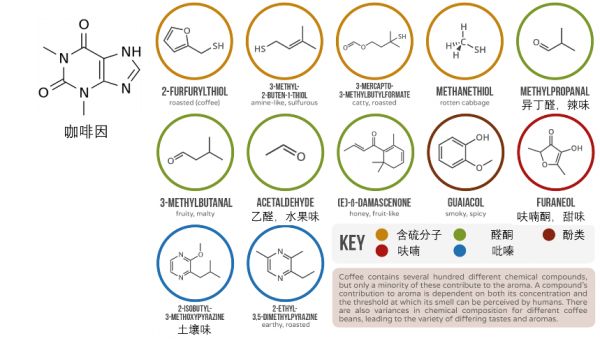 如图2所示,除了最直接被需求的咖啡因分子之外,各种芳香类分子、有机酸分子、碳水化合物、脂类等综合在一起构成了咖啡的风味,例如异丁醛提供了辣味,乙醛带来了水果香味,呋喃酮会让咖啡产生回甘,而吡嗪类则给咖啡带来土壤的味道,等等。