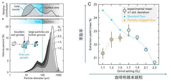 图4 (A-B)咖啡粉的粒径分布;(C)固定萃取压力至6bar情况下,咖啡粉研磨粗细与萃取率的关系。蓝线是标准流体模型,即颗粒越细,萃取率越高;黄线是部分阻塞的流体模型,即有大有小的咖啡粉情况下,流体不会均匀流下。圈圈为实际情况,细研磨情况下接近黄线,粗研磨情况下接近蓝线。