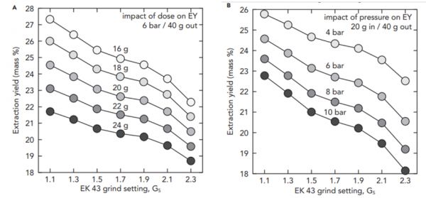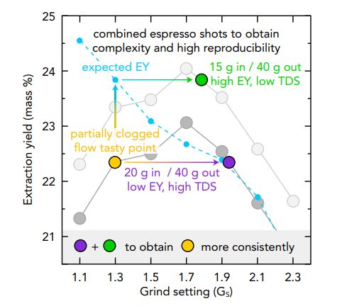 在实验中,当磨豆机设置颗粒较细时,实际萃取率(圆圈)更接近部分阻塞流体;而当设置颗粒较粗的时候,由于部分阻塞现象不复存在,实际萃取率(圆圈)更接近标准流体。