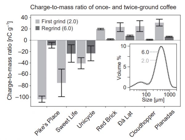 咖啡粉带电会导致咖啡粉团聚,影响其粒径分布。研究者发现,咖啡豆的品种、烘焙方法与研磨获得的咖啡粉带电情况和粒径分布关系不大,但深度烘焙的豆子相对带电较少,咖啡粉团聚较为微弱。这也许就是星巴克店里用深度烘培豆子偏多的原因?