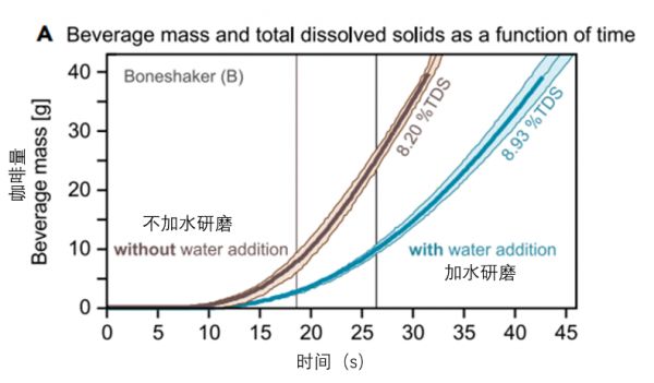 图9 研磨时在咖啡豆喷一点水,咖啡粉团聚减少,粒径更细。因此咖啡液流出速度变慢,咖啡浓度增加