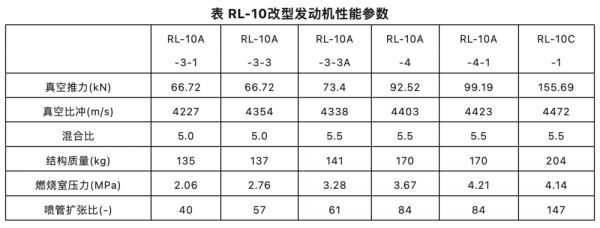 以RL-10为例,它是土星I运载火箭上面级发动机和通用上面级半人马座系列的主发动机,由美国普惠公司于1958年~1963年研制。发动机定型后,根据各种航天任务的具体要求对RL-10发动机进行了持续不断的改进,形成了具有多种改型的发动机系列,包括:RL-10A-3-3A、RL-10A-4、RL-10A-4-1、RL-10A-5、RL-10C-1等。各种改进中,包括提高燃烧室压力、提高发动机推力、提高混合比、安装可延伸喷管大幅扩大喷管面积比等。它的几种改型主要性能参数如下: