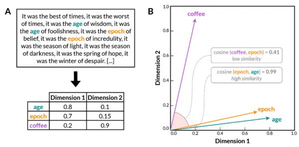 ▷图1. 多维向量空间中词嵌入的一个例子。A. 一个在自然语言语料库上训练的词嵌入模型学会将单词编码成多维空间中的数值向量,为了视觉上的清晰性而简化为两维。在训练过程中,上下文相关的单词(例如“age”和“epoch”)的向量变得更加相似,而上下文无关的单词(例如“age”和“coffee”)的向量变得不那么相似。B. 在经过训练的模型的二维向量空间中的词嵌入。具有相似含义的单词(如“age”和“epoch”)被放置在更靠近的位置,这由它们的余弦相似度得分高度表示;而具有不同含义的单词(如“coffee”和“epoch”)则相对较远,反映在余弦相似度得分较低上。余弦相似度是一种用于确定两个非零向量夹角余弦的度量,反映它们之间的相似程度。余弦相似度得分越接近1,表示夹角越小,向量之间的相似度越高。(图片引自[3])
