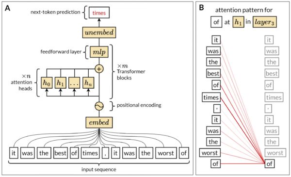 ▷图2. A. LLM的自回归模型变体的结构体系。来自输入序列的tokens首先被嵌入为向量,这涉及将每个token转换为一个高维空间,其中在语义上相似的token具有相应相似的向量。位置编码将关于每个tokens在输入序列中位置的信息添加到向量中。然后,这些丰富的向量通过连续的Transformer块进行处理。每个块包含多个attention heads,可以并行处理所有向量,以及一个全连接的前馈层,也称为多层感知机(multilayer perceptron, MLP)层。最后,在取消嵌入阶段,向量经历线性变换,将它们投影到一个与词汇大小相同的空间中,生成一组Logits。这些Logits表示词汇中每个潜在下一个token的未归一化分数。然后应用柔性最大值传输函数层,将这些逻辑转换为对词汇的概率分布,指示每个token成为序列中下一个token的相对可能性。在训练过程中,已知正确的下一个token并用于反向传播,而在推理过程中,模型在没有此信息的情况下预测下一个token。可以迭代地以自回归方式重复此过程,以生成多个token的预测。B. 自注意机制的可视化。每个attention head为序列中的每个标记分配权重或注意力分数,该分数适用于包括在内的序列中的每个标记0−。在这里,每条红线表示‘of’与输入序列中的每个其他标记之间的注意力分数,包括自身。在此示例中,注意力分数量化了每个标记相对于标记‘of’的相关性或重要性,较粗的线表示较高的分数。这个模式说明了注意力机制允许模型动态关注输入序列的不同部分,以得出每个标记的具有上下文细微差别的表征。每个attention head的注意力模式都不同,因为在训练过程中,每个头专门关注于选择性地关注标记之间的特定依赖关系。(图片引自[3])